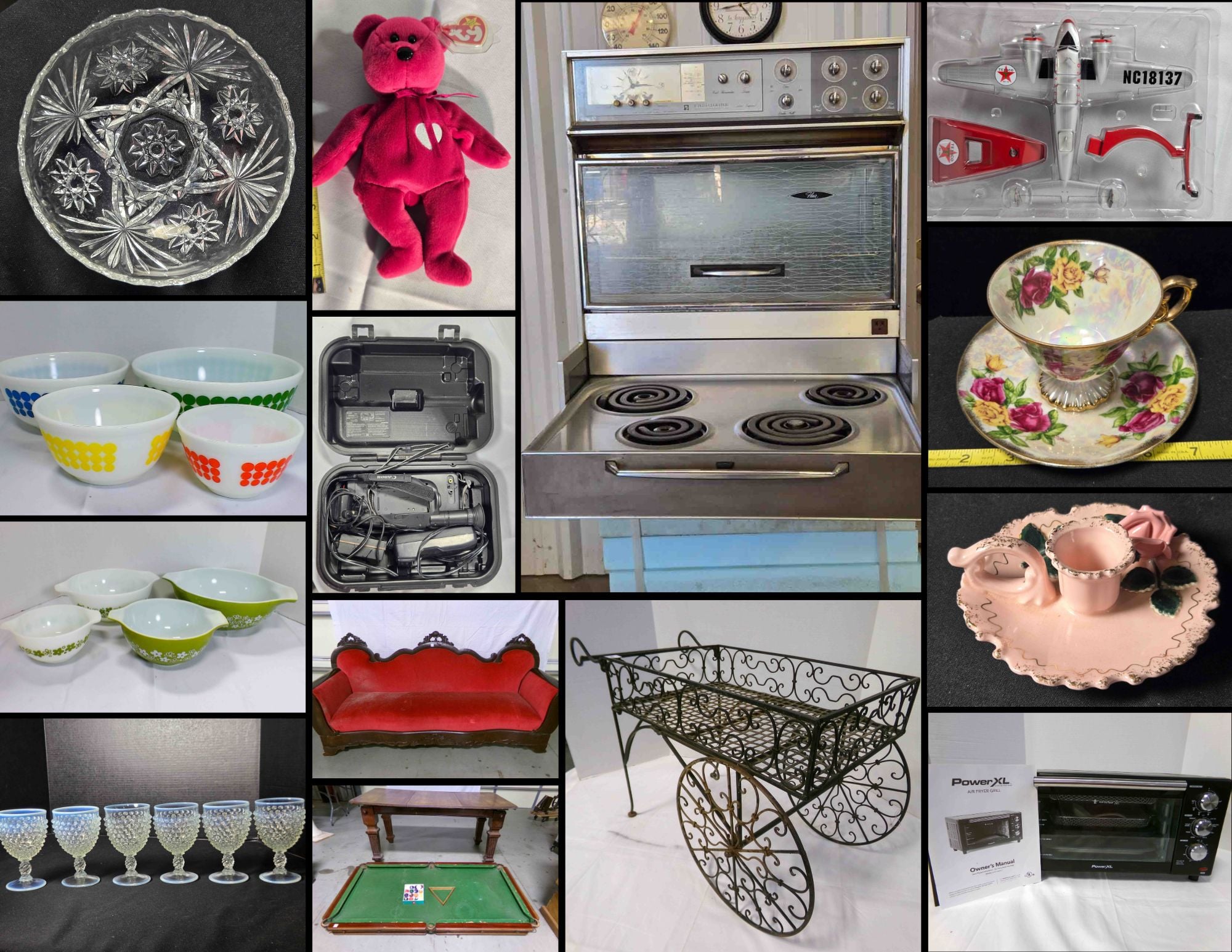3/16 Depression – Desert Rose – Pyrex Mixing Bowls – Frigidaire Flair Stove – Bavaria China – Frankoma – GI Joe- Star Wars – Texaco Toys – LPs – Candlewick – Miss America – Manhattan – Barbie Dolls – Matchbox & Hot Wheels – Glassware