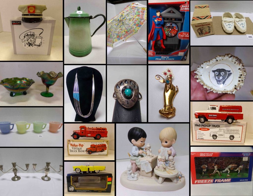 Sports Memorabilia – Belt Buckles – Sterling Silver – Diecast Banks – Costume Jewelry – Precious Moments – Watches – Microwave – Glassware -Insect Collection