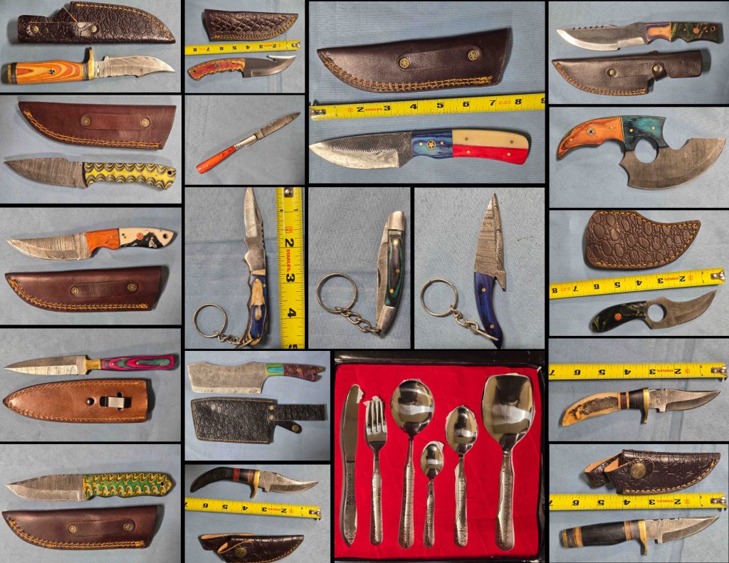 2/22 Damascus Steel – Pocket Knives – Cleavers – Serrated Blades- Flatware – Daggers – Ulu – Key Chain Knives – Fixed Blades – Leather Sheaths