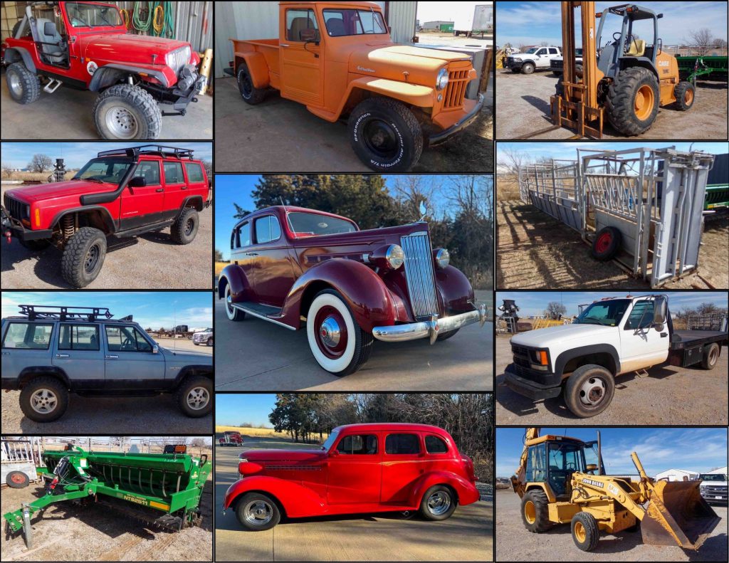Backhoe – Trailers- Pick ups- Mower- Collector Cars – Trucks – Cattle Equip – No-Till Drill – Jeeps – Forklift – Pipe – Grass Seeder